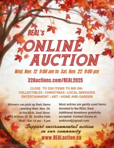 Auction Items. We have some great gently used items we’ve been setting aside all year from REAL Deal donations. But we would also like to add to the variety with home made things (food, birdhouses, crafts), eco-friendly gifts, tickets and gift certifi-cates for goods or services. Please contact Donna by October 31 if you have some-thing to offer and to confirm it is suitable. We can continue to add things until we reach our limit of 200 items. Sorry, we are unable to include furniture in this auction.