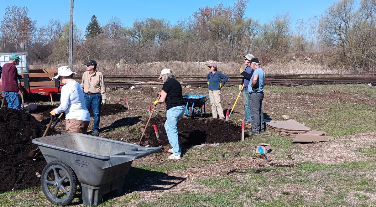 Volunteers worked the morning of April 27 to lay the necessary layers. First cardboard was laid down and wet. Then came a layer of well-composted leaves, a lay of topsoil and finally a layer of wood chips. Thanks to the Town of Smiths Falls for providing the compost and soil and delivering it that day. The railway museum had a stockpile of wood chips that we used. Now we wait 5-6 months for the layers to mature into suitable forest soil.